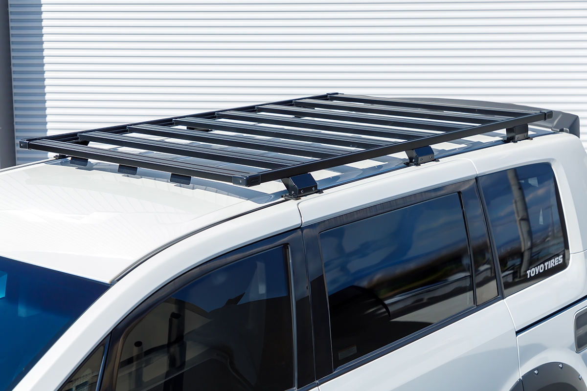 ■JAOS フラットラック 1250×1920 (ロータイプ) 本体は軽量かつ強固なアルミ押し出し材を採用し、車両重量の増加を抑えながらもハードユースを想定したタフネス仕様。フロアバーに設けたTスロットにオプションを装着することにより、用途に合わせたアレンジや自分好みのスタイルへ拡張することができます。多彩な機能性と信頼の“MADE IN JAPAN”にこだわった高品質なルーフラックです。 ・品番:B412305NM |