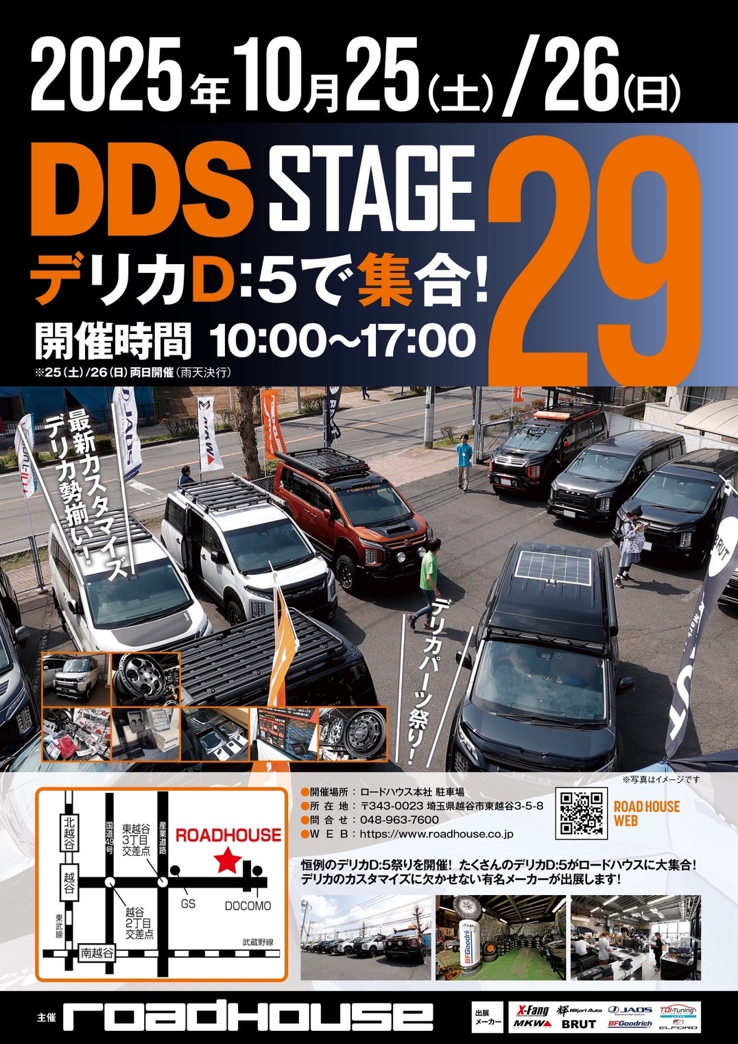4WD&SUV専門店 ロードハウス様主催の「DDS STAGE 29」が10月25日(土)・26(日) に開催されます。DELICA D:5のカスタマイズを得意とする有名パーツメーカーが多数出展し各社デモカー展示やカスタマイズ相談、限定価格でのパーツ販売など盛りだくさんのイベントです。さらに、イベント期間中は抽選会やレッツゴー4WD誌による愛車の撮影もございます。