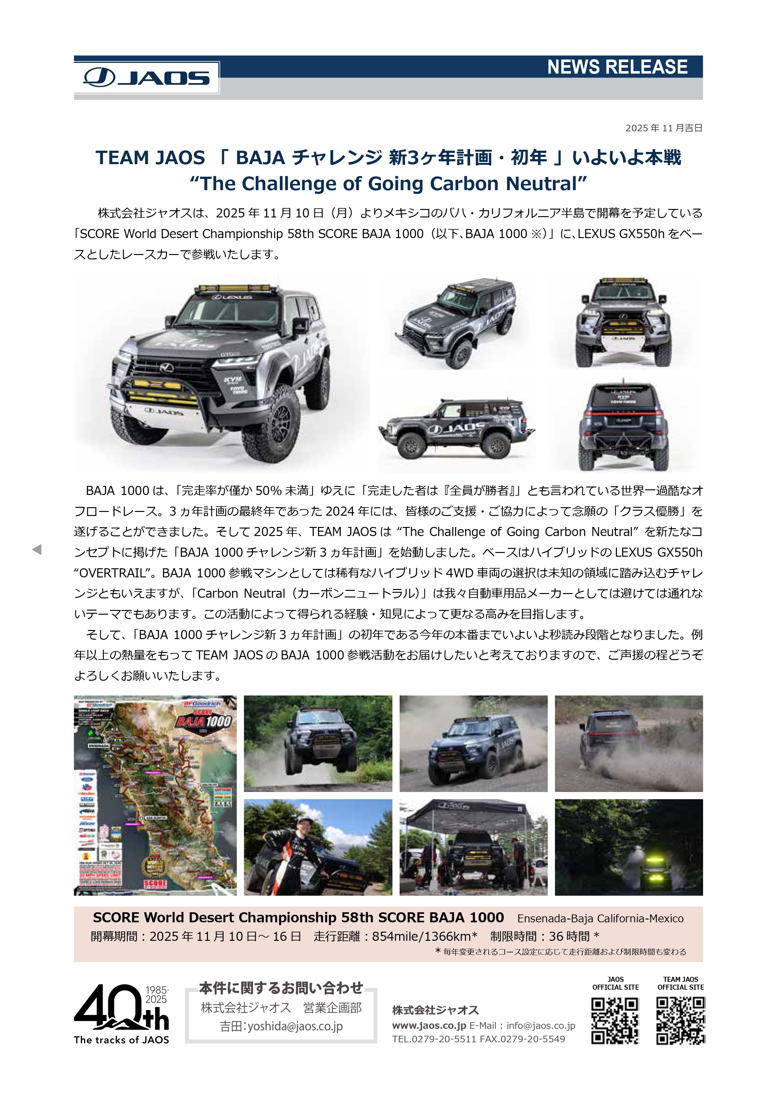 株式会社ジャオスは、2025 年11 月10 日(月)よりメキシコのバハ・カリフォルニア半島で開幕を予定している「SCORE World Desert Championship 58th SCORE BAJA 1000(以下、BAJA 1000 ※)」に、LEXUS GX550h をベースとしたレースカーで参戦いたします。