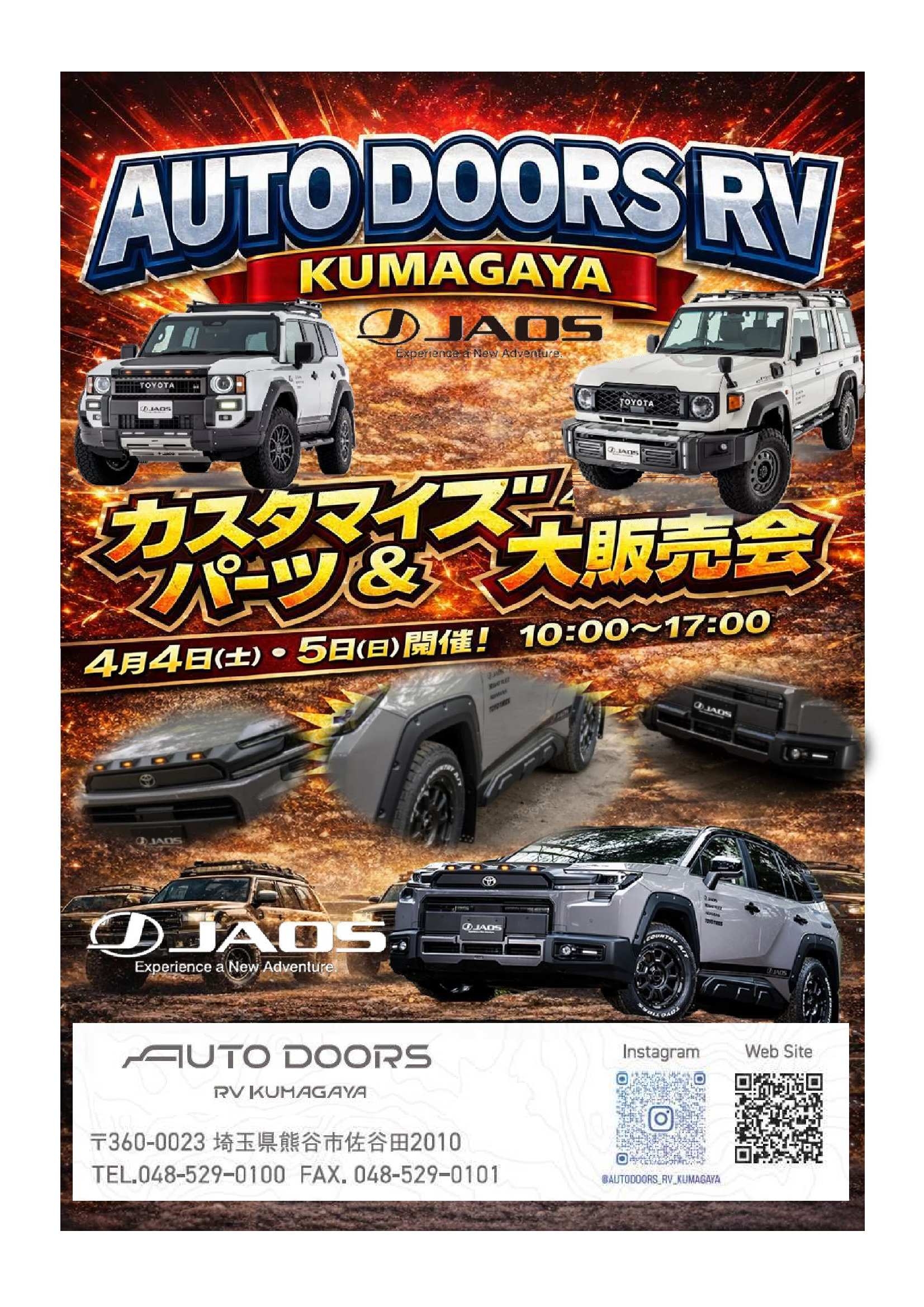 4月4日(土)、5(日)にAUTO DOORS RV KUMAGAYA(埼玉トヨペット(株)熊谷支店)にて、カスタマイズパーツ販売会が開催されます。