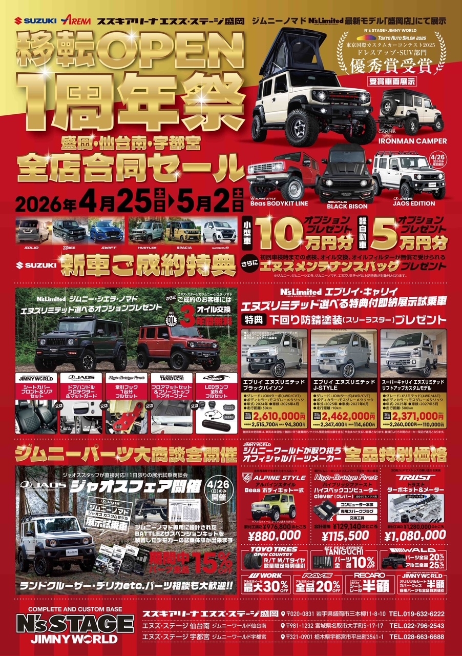 4月26日(日)にエヌズ・ステージ盛岡にて「JAOSフェア」が開催されます。進化を続けるジムニーノマドデモカーを展示し、イベント特価による商品のご案内やグッズの販売、JAOSスタッフによるカスタマイズ相談を受け付けます。また、先日発表をおこなったBATTLEZリフトアップセットの試乗体感も可能です。この機会にぜひご来場ください。