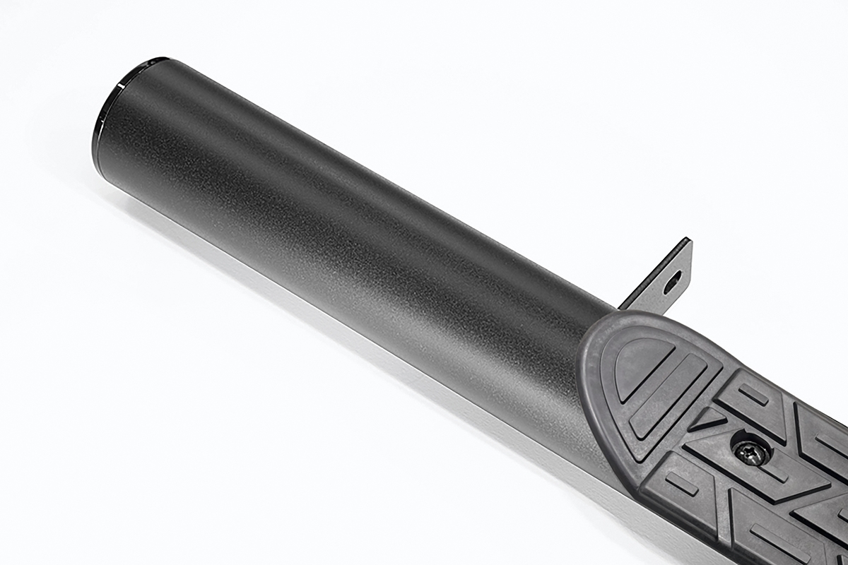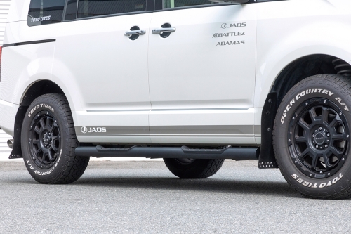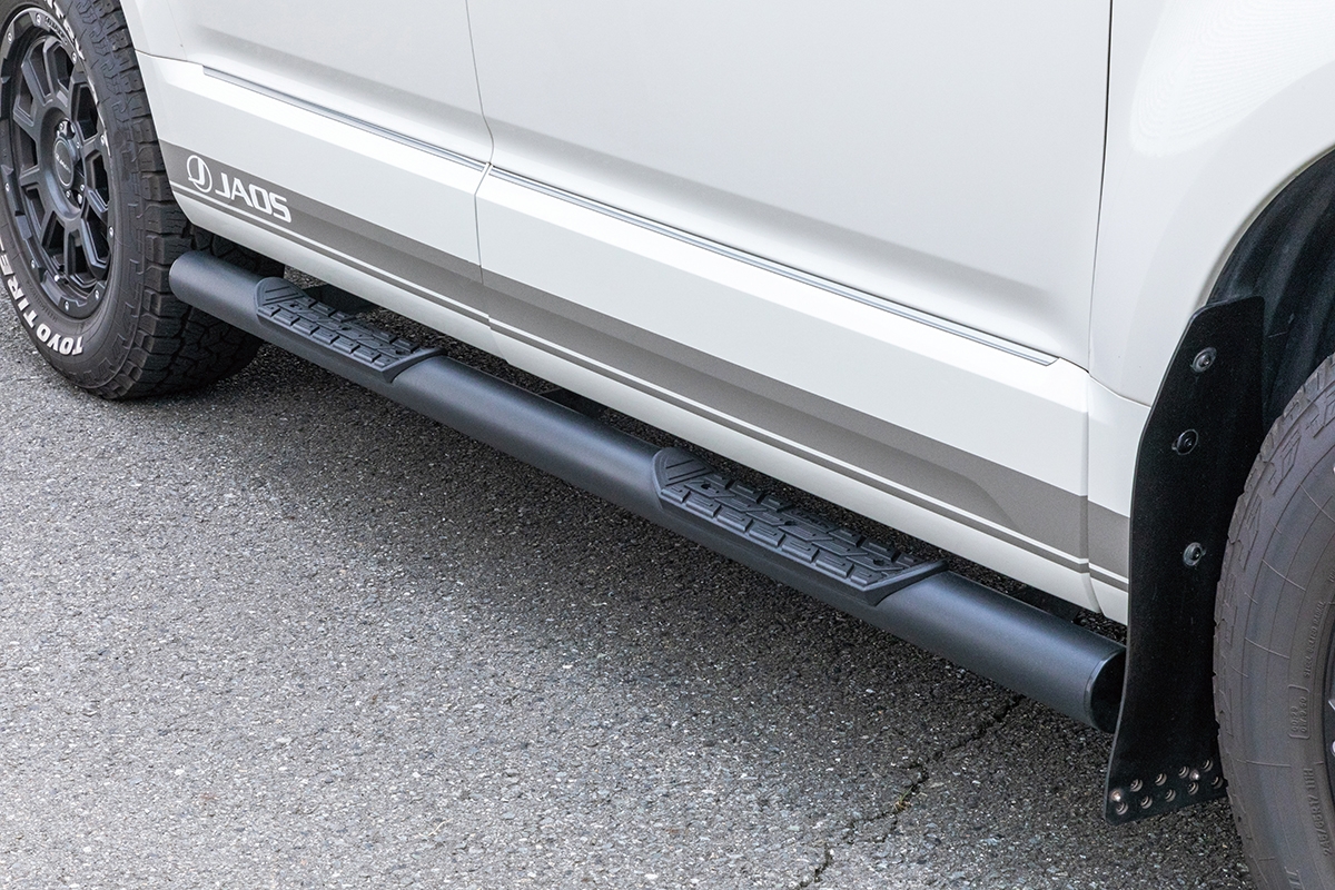 本体は使い勝手と大型SUV でも十分に存在感を発揮できる太めのφ76.2のスチールパイプを採用し、カチオン電着塗装とブラック粉体塗装の2コートを施したタフネス仕様です。また、乗降時に足をかける部分には耐候性と実用性に優れた高品質なインジェクション成形樹脂のステップを使用。サイドビューにワイルドな印象を与えます。