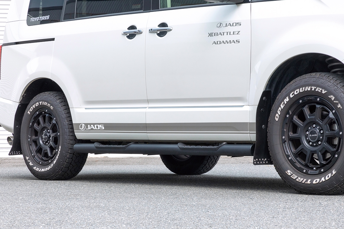 JAOS サイドステップシリーズには、すべり止めとして樹脂製ステッププレートを装備しています。雨天時だけではなく、雪や泥が付着した場合にも確実に脚をかけて安全にクルマから乗り降りをすることができます。度重なる検証の結果を踏まえてデザインされたステップ部のパターンは、脚をかけた際の感触や見た目の良さにもこだわりました。スタイリングだけではなくサイドステップとしての機能性を両立させています。