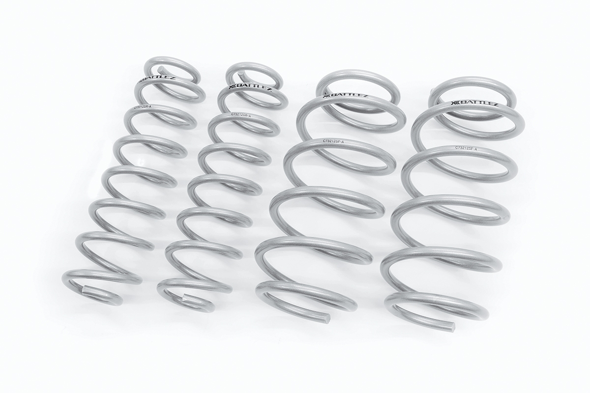 従来のBATTLEZコイルに使用していた素材(SAE9254/SAE9254V)等と比較して、チタン(Ti)を配合しただけではなく、銅(Cu)ニッケル(Ni)クロム(Cr)バナジュウム(V)の添加量を増やしています。これにより大気耐久性・腐食耐久性・耐ヘタリ性等を損なうことなく高硬度・高応力化を達成。高応力を活用した細い線形による設計が可能となり(線間の拡大)、4WD&SUVにとっては需要な有効ストローク長をさらに確保できるようになりました。さらにコイル重量も軽減しています。