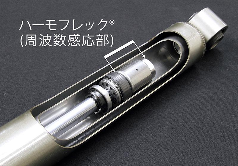 KYB株式会社によって開発された周波数感応バルブ「ハーモフレック®」を搭載。路面状況等から受けるダンパーの動きを周波数として解析し、減衰力を可変させます。高い周波数時(速く小さな動き)は可変オリフィス(オイル経路)を解放して、基本以上のオイル量を確保することで減衰力を低減、コーナリング時などの低い周波数時は(大きくゆっくりな動き)可変オリフィスを閉じて減衰力を高め、乗り心地と安定性を両立します。