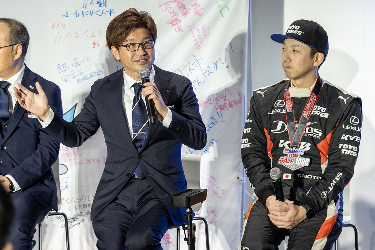 「2025年BAJA 1000参戦報告会」では、LEXUS GX550h “OVERTRAIL” TEAMJAOS 2025 ver.の実車展示の他、Lexus Internationalからは横尾チーフエンジニア、現地で活躍したエンジニアなどチーム関係者が一堂に集結、新聞社・雑誌社などの報道関係者に向けて2025年BAJA 1000の結果報告が行われた。当日は地元FM群馬でお馴染みのラジオパーソナリティ内藤聡さんがMCを務め、SCORE BAJA 1000 史上初のハイブリッドモデルの完走を裏話を交えながらお伝えいたしました。